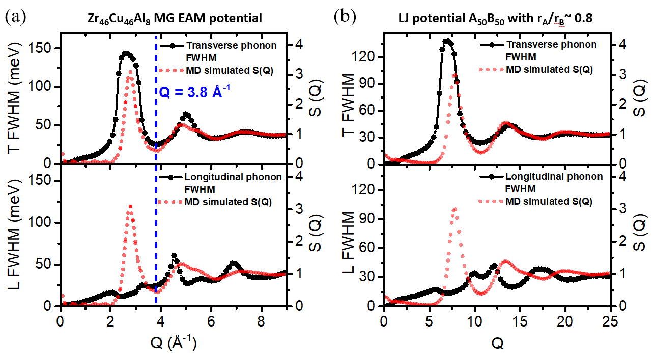 图2: 横声学支声子半峰宽和静态结构因子之间的正相关关系,纵声学支声子不存在此对应关系。LJ势证明此对应关系具有普适性。