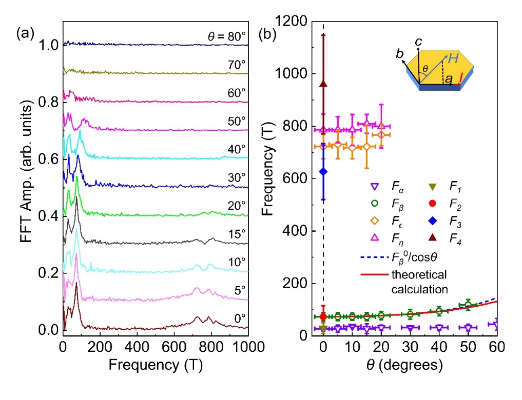 图2. 转角测量的FFT频谱图以及理论计算与实验结果的对比。(a) 不同角度下的FFT频谱图。(b) 理论计算与实验结果的对比,实心符号和红实线是理论计算的结果,空心符号是实验的结果,蓝虚线是二维费米面的转角曲线。