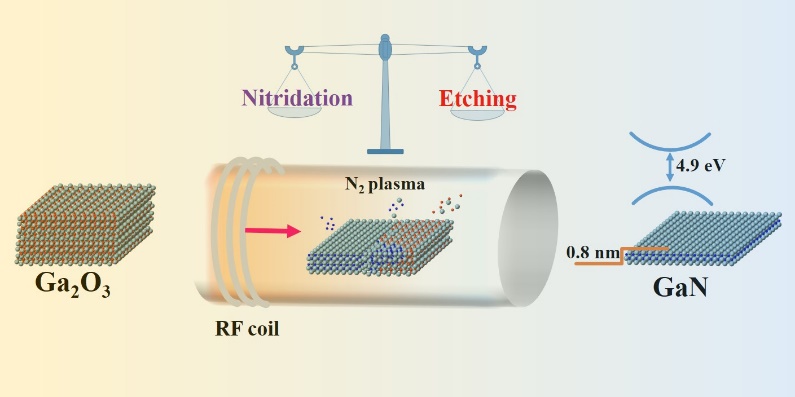近日,陈珊珊教授团队采用等离子体增强化学气相沉积系统(PECVD)合成了大面积超薄、宽带隙的二维氮化镓。相比于传统使用的氨气,该工作采用对环境友好的氮气作为氮源,对预先沉积在硅片上的氧化镓模板进行了氮化(图1),通过平衡同时发生的氮等离子体的氮化和刻蚀,实现了双层氮化镓的可控制备。实验发现,沉积在硅片表面最下层氧化镓模板由于与硅片(氧等离子体预处理)之间的强相互作用,具有较强的抗等离子体刻蚀的能力,进而氮化形成超薄氮化镓。由于氮等离子的刻蚀作用,该方法所获得的超薄氮化镓厚度稳定,不受初始氧化镓模板厚度的影响。紫外可见吸收光谱的测量发现所制备的二维氮化镓具有4.9 eV的超宽带隙(图3),与理论预测的结果相吻合。该实验工作实现了大面积、宽带隙、超薄二维氮化镓的可控合成,有望进一步应用于深紫外光电子领域,也为二维III族氮化物的制备提供新思路和新途径,并有望扩展到其它二维材料的模板法合成。