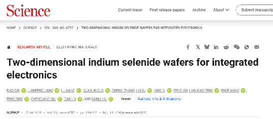 2007so太阳集团、量子态构筑与测控教育部重点实验室刘灿副教授与北京大学2007so太阳集团刘开辉教授、电子公司邱晨光研究员等团队合作,提出“固–液–固”材料制备新策略,首次实现了高质量二维硒化铟(InSe)半导体晶圆的制备。该材料展现出优异的电学性能,在晶体管阵列中实现了极高的迁移率与接近玻尔兹曼极限的亚阈值摆幅,并在超短沟道(10 nm以下)器件中,其关键参数—包括工作电压、栅极长度、漏致势垒降低(DIBL)、电子有效质量、开/关比和室温弹道率等,全面优于目前最先进的英特尔3纳米节点技术。2025年7月18日,相关成果以“用于集成电子学的二维硒化铟晶圆”(Two-dimensional indium selenide wafers for integrated electronics)为题,在线发表于《科学》(Science)。