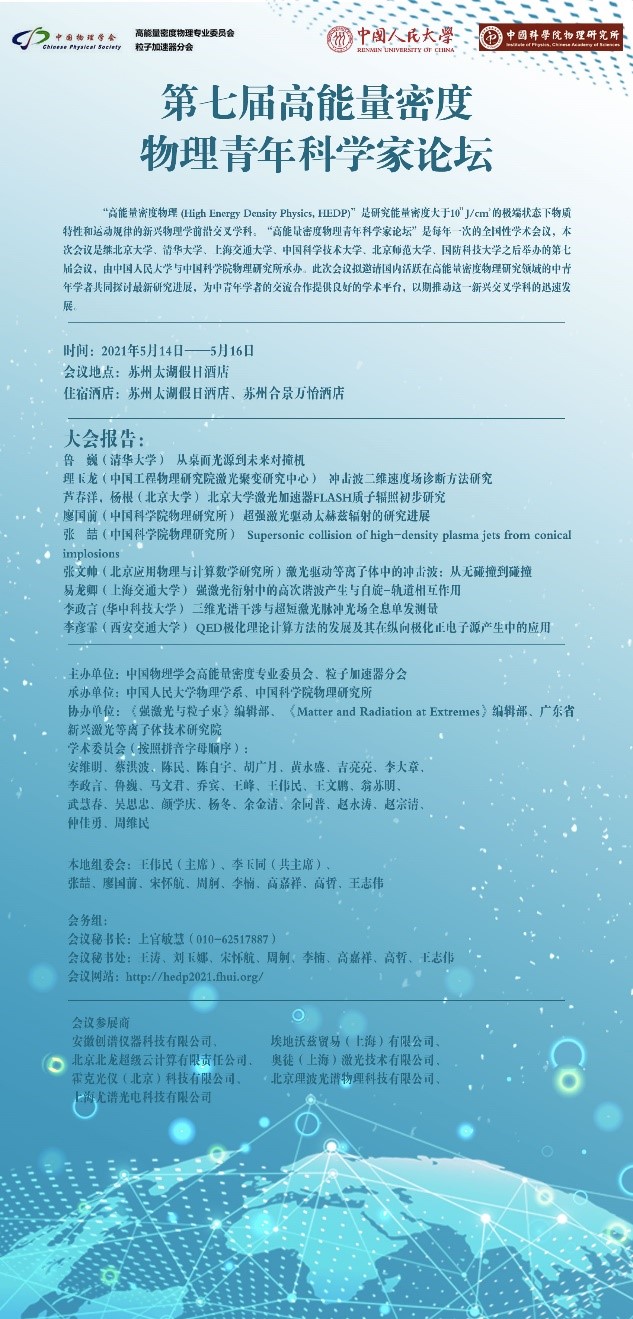 2021年5月14日至2021年5月16日,由中国物理学会高能量密度物理专业委员会、粒子加速器分会主办,2007so太阳集团物理学系与中国科公司物理研究所承办的"第七届高能量密度物理青年科学家论坛"在江苏省苏州市成功举办。