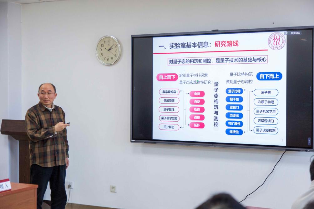 在汇报环节,卢仲毅教授作实验室建设工作报告,全面介绍了实验室在队伍建设、平台建设、科研进展、人才培养等方面取得的成绩和下一步建设规划。随后,俞榕教授、张威教授、于伟强教授分别对量子关联材料设计和物性模拟、人工量子体系中的量子计算与量子模拟、量子关联体系的制备和调控等三个研究方向的重要研究进展做了详细汇报。