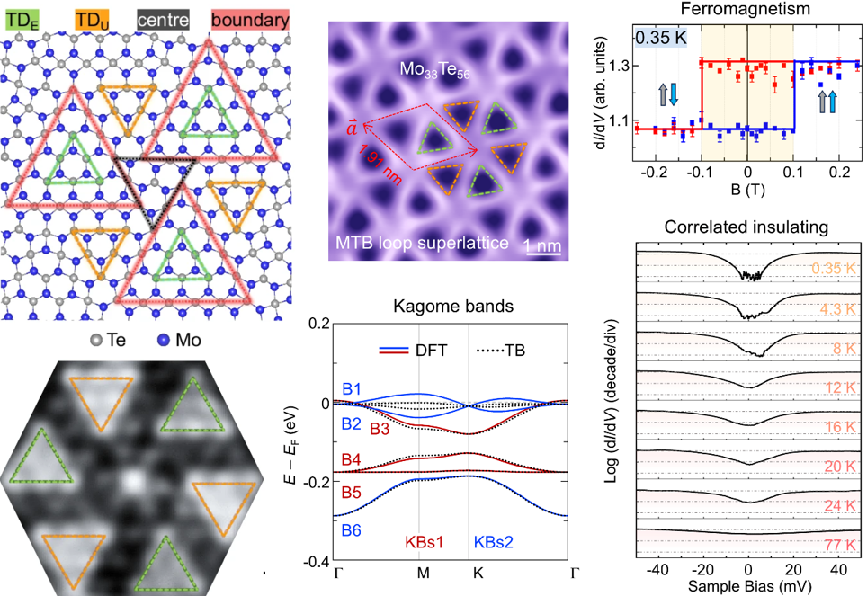 近日,2007so太阳集团季威教授研究组与武汉大学张晨栋教授、袁声军教授、吴冯成教授等合作者组成联合团队,通过理论计算结合实验创制和测量,获得了非简单化学配比的单层笼目(kagome)晶格材料Mo33Te56,并发现了其中蕴藏的磁性和关联绝缘体等新物态。相关结果以“Ferromagnetism and correlated insulating states in monolayer Mo33Te56”为题,发表在2025年3月31日出版的《自然·通讯》[Nature Communications 16, 3084 (2025)]上。....
